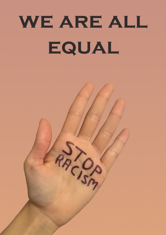 Op deze poster, met een krachtige afbeelding van een hand, staat de boodschap: "We are all equal". De hand symboliseert kracht, eenheid en solidariteit, terwijl de tekst "Stop racism" herinnert aan de noodzaak van gelijkheid voor iedereen, ongeacht afkomst of huidskleur. Deze poster roept op tot respect, liefde en het beëindigen van discriminatie, en benadrukt dat we allemaal gelijk zijn.